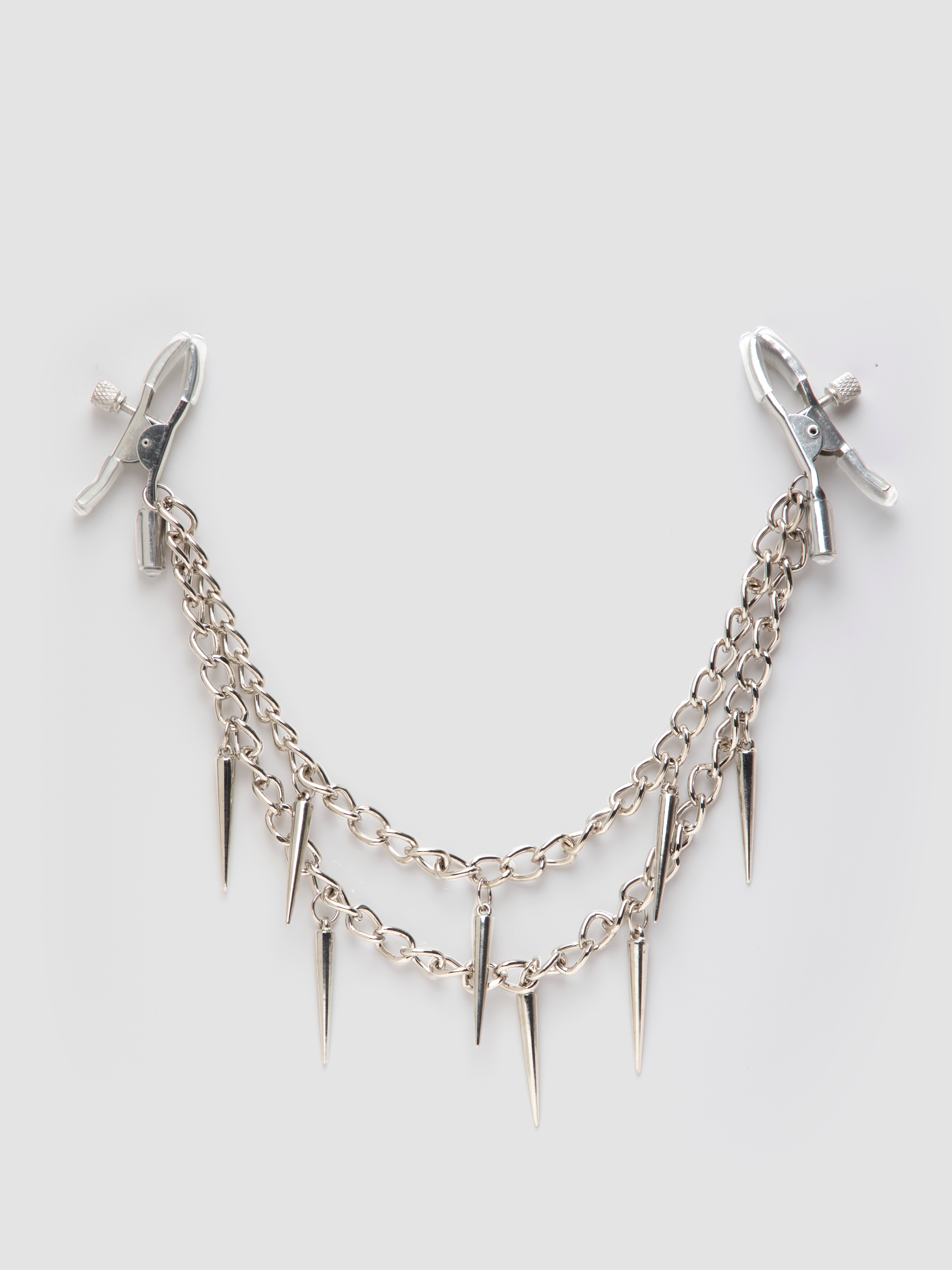 Give your nipples a little clip and awaken your senses for new levels of sexual pleasure. BDSM exploration comes easy with this set of crocodile-clip-style nipple clamps, finished with rubber tips and joined by a metal chain adorned with spikes.