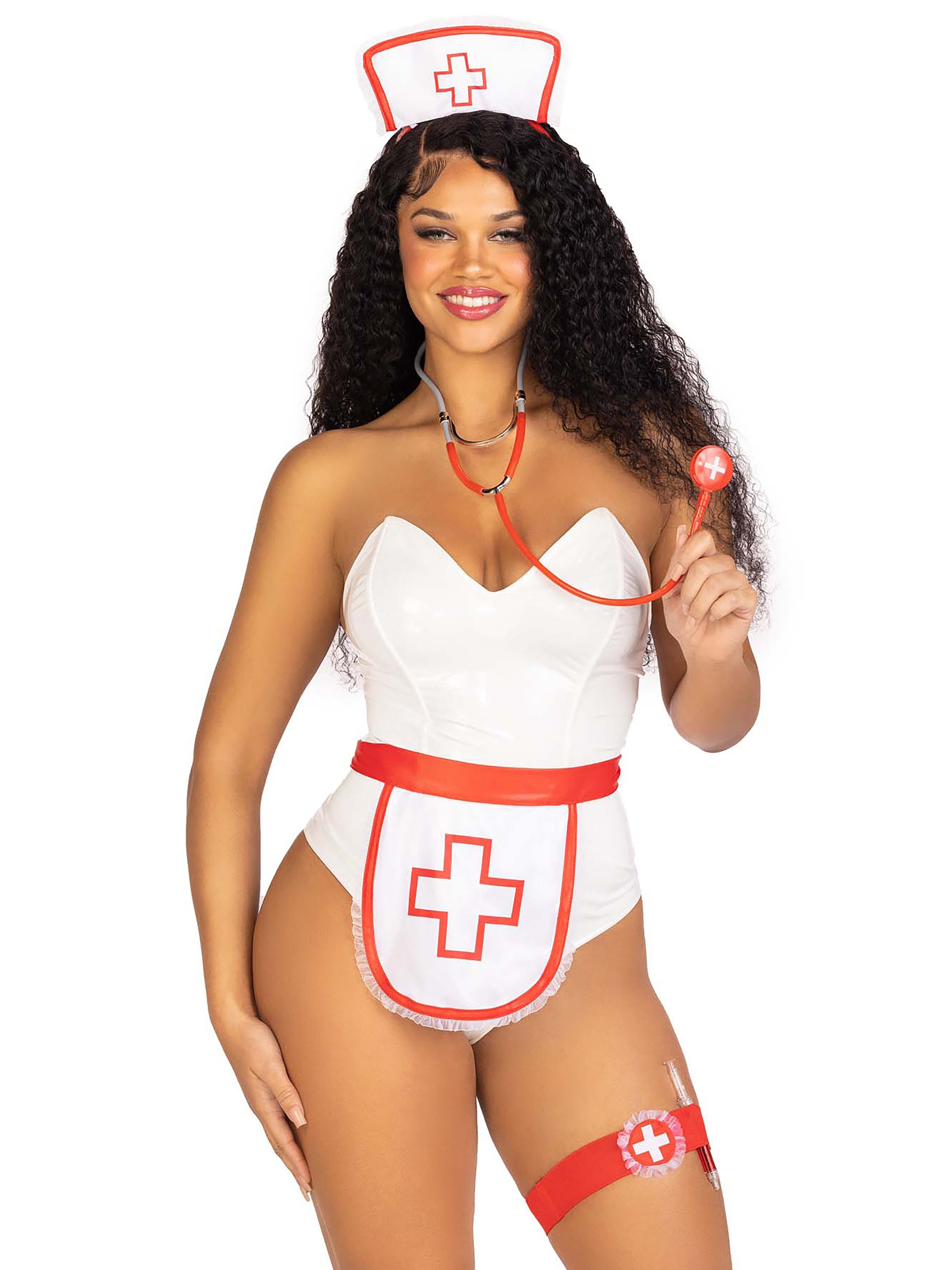 Turn up the heat in this five-piece nurse costume kit from Leg Avenue. Featuring a lace-trimmed apron with signature nurses cross design, matching headband, stethoscope, garter and syringe-pen accessory. Gorgeous to look at, this kit is almost too sexy for words. Who needs to talk anyway?