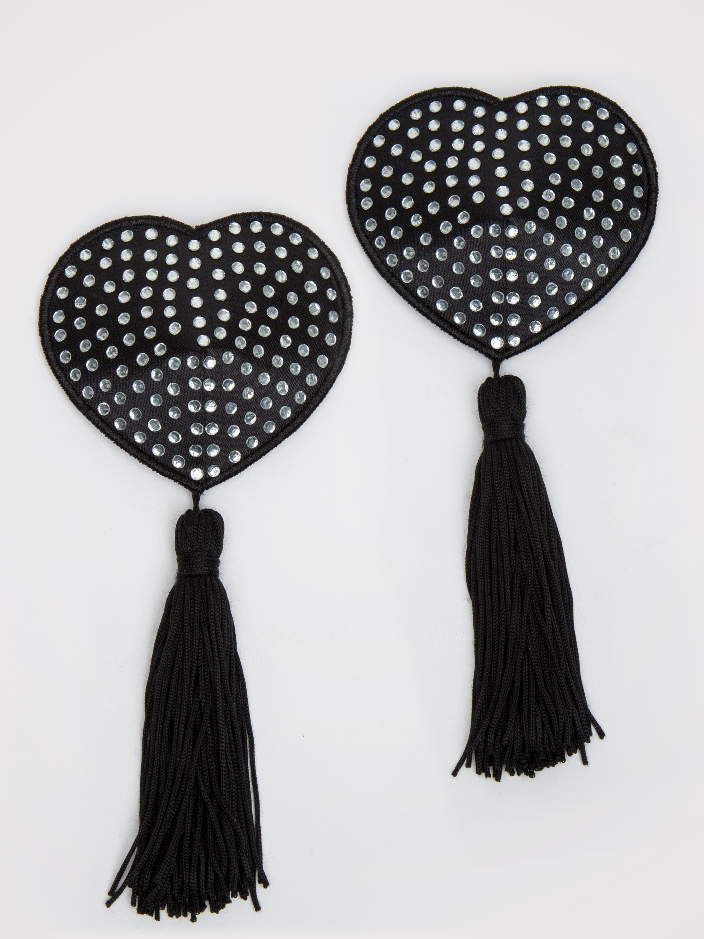 Formed in silky black satin, these heart-shaped pasties cover your nips and keep your lover transfixed, while the cheeky tassels cascade and twirl as you shimmy.