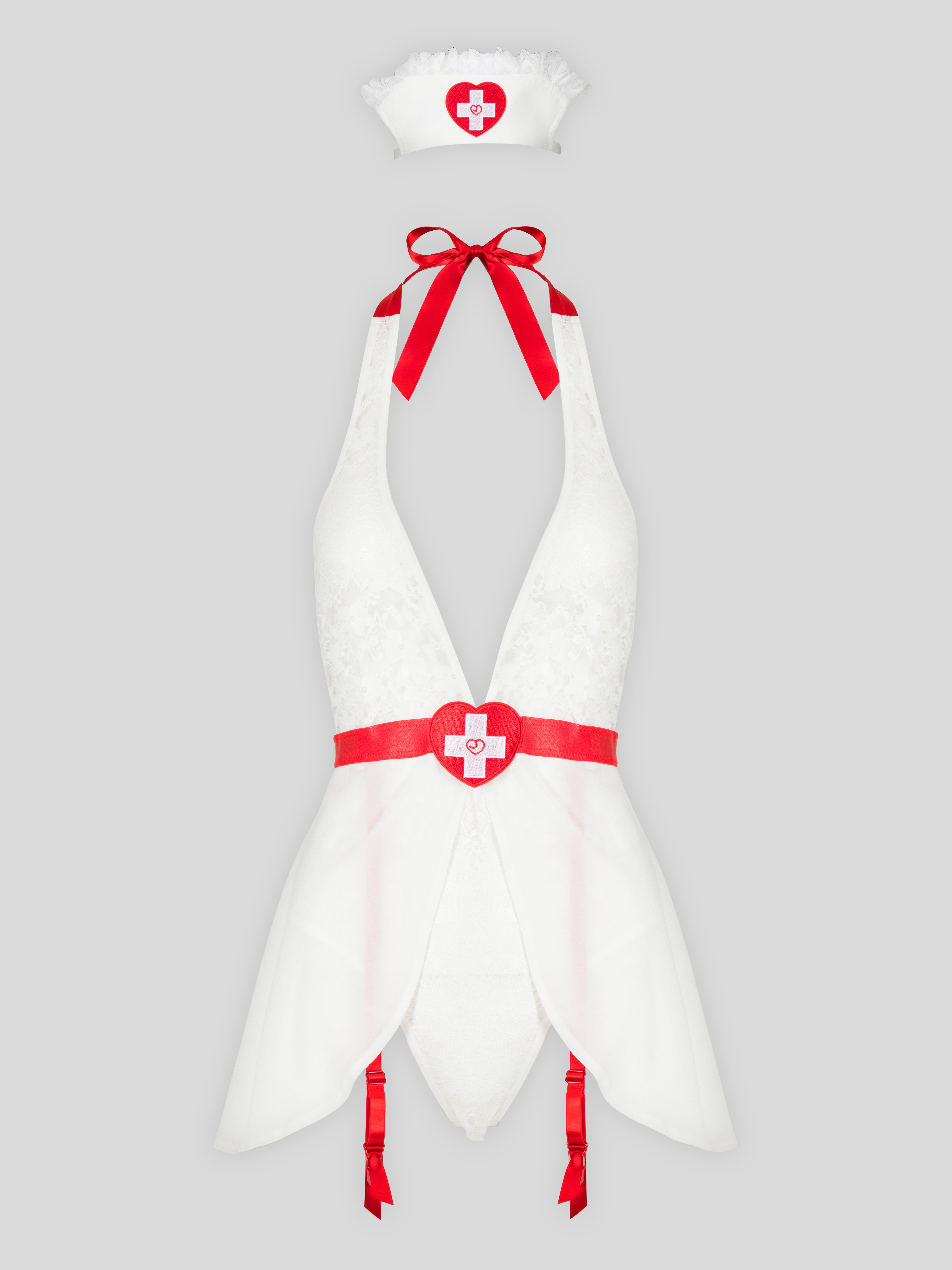 Each set features an open-back body with suspender straps, and a matching nurse's cap to finish the look.