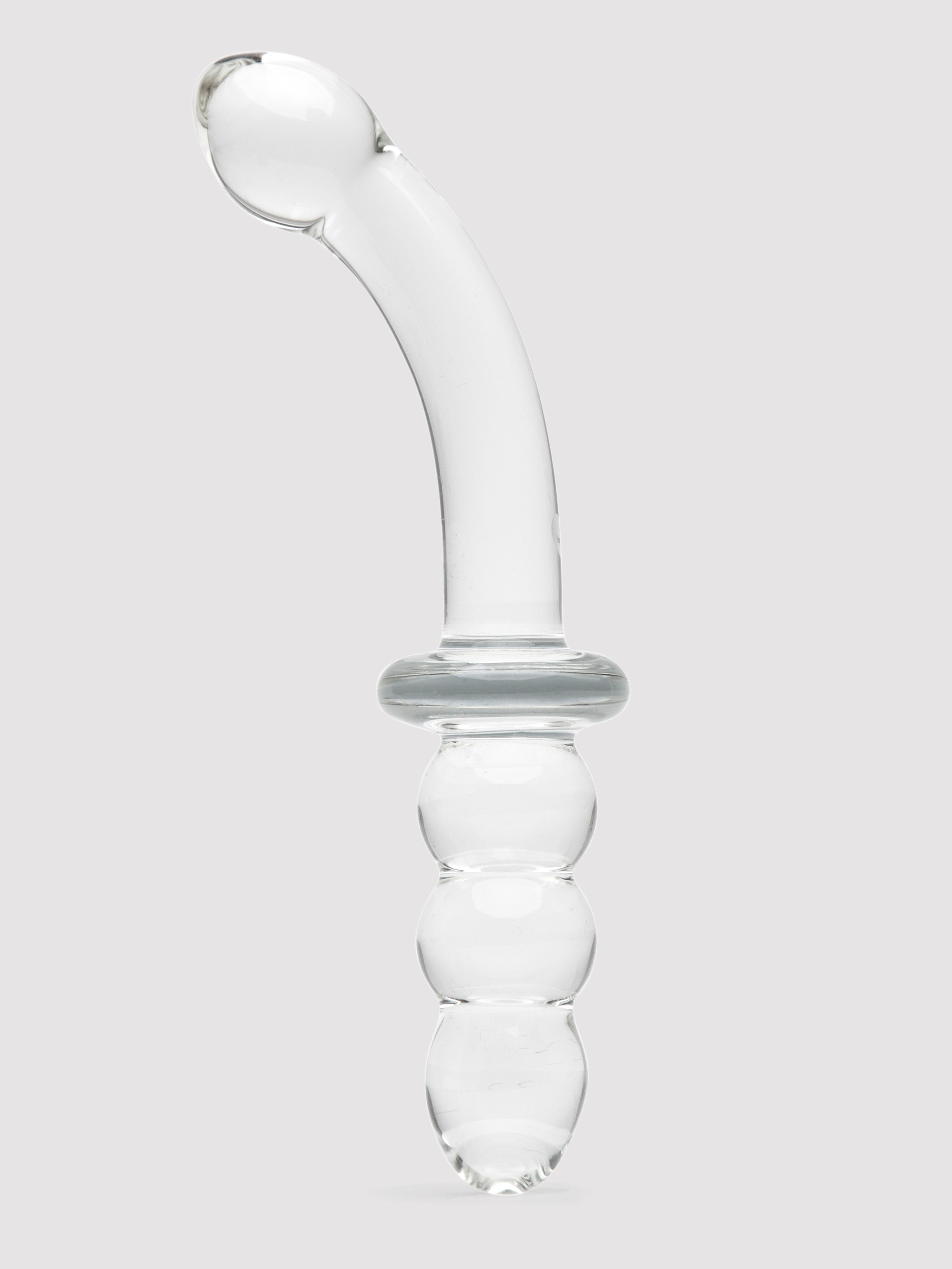 - G-spot glass dildo with two ends to choose from: ribbed and curved
