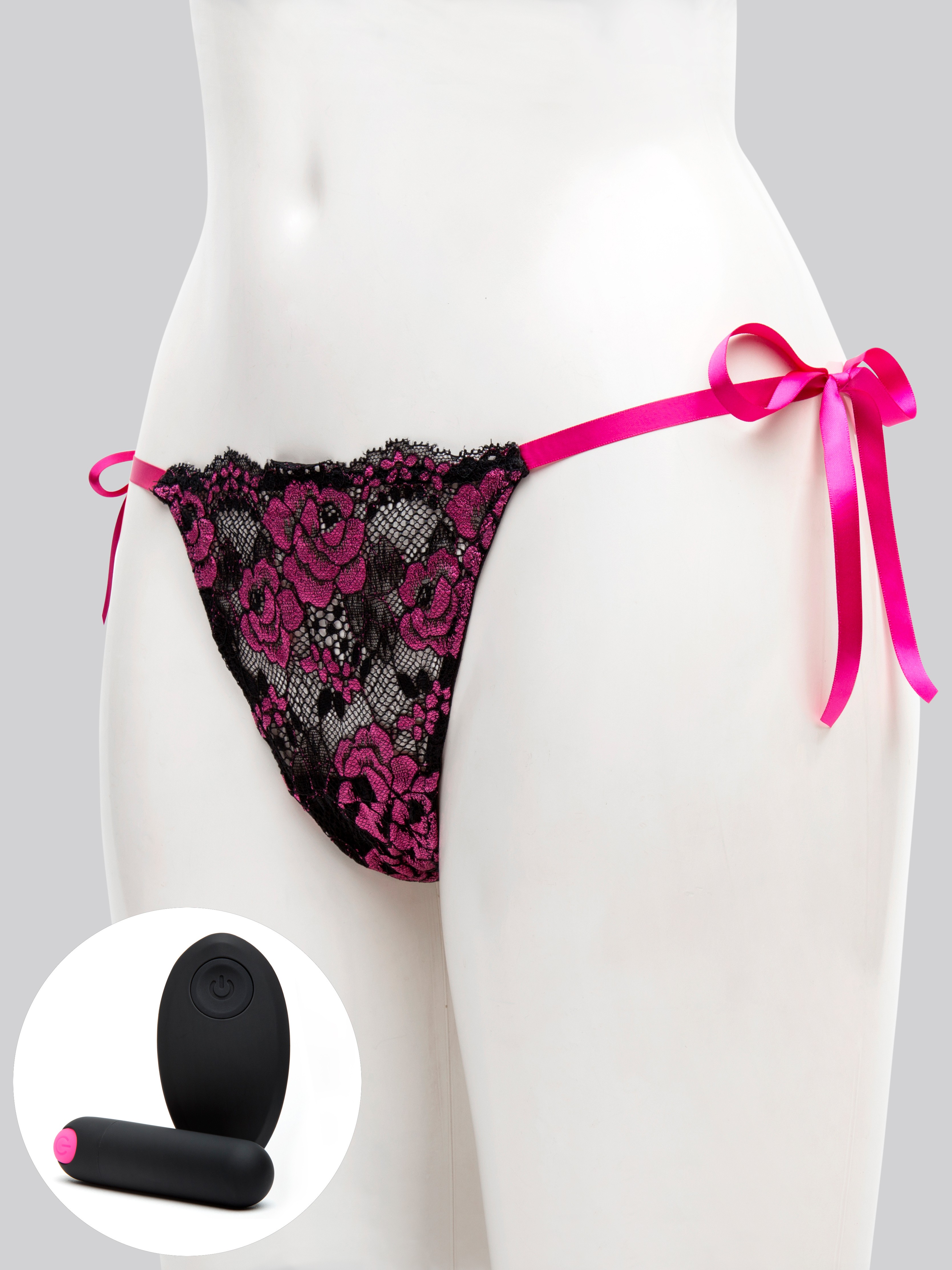 Don't be shy, just untie! This vibrant, lacy black and pink thong ties at the sides for a sultry fit that keeps the bullet in the gusset, vibing against your clitoris. Pass the remote to your lover for 10 sizzling functions of foreplay-boosting fun.